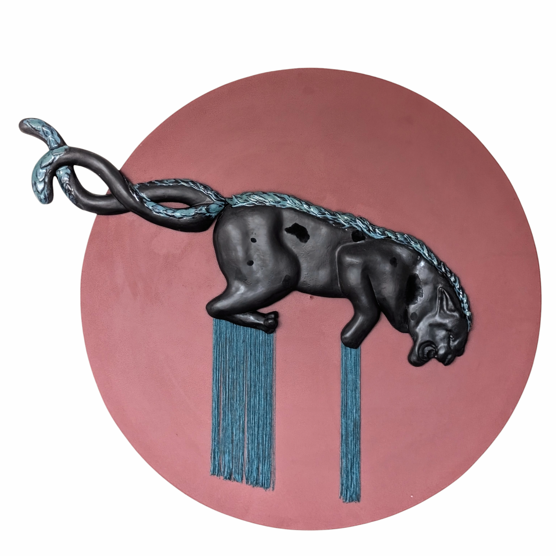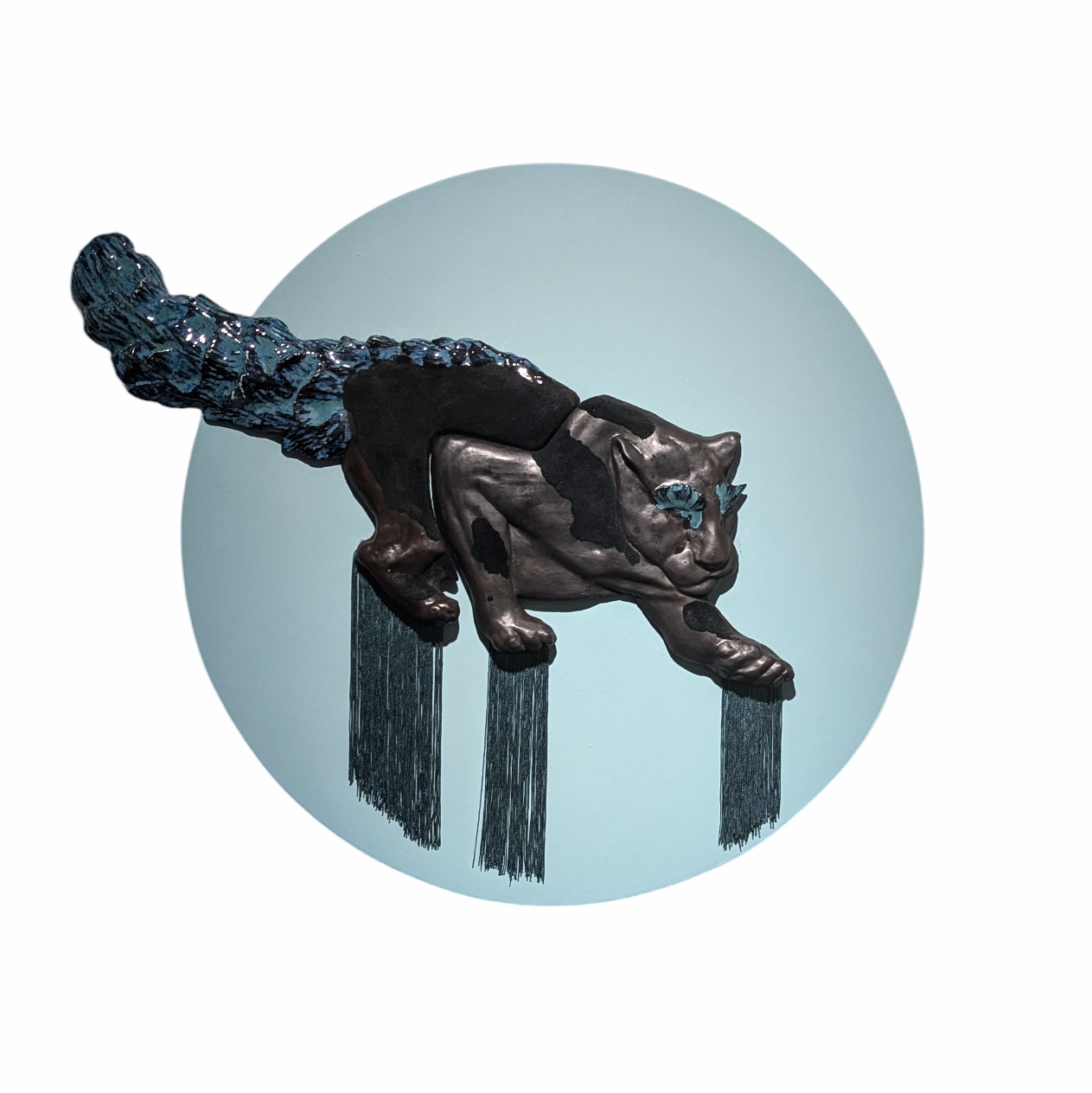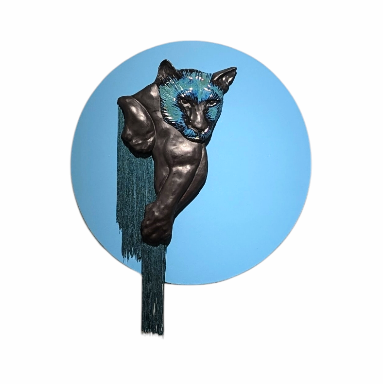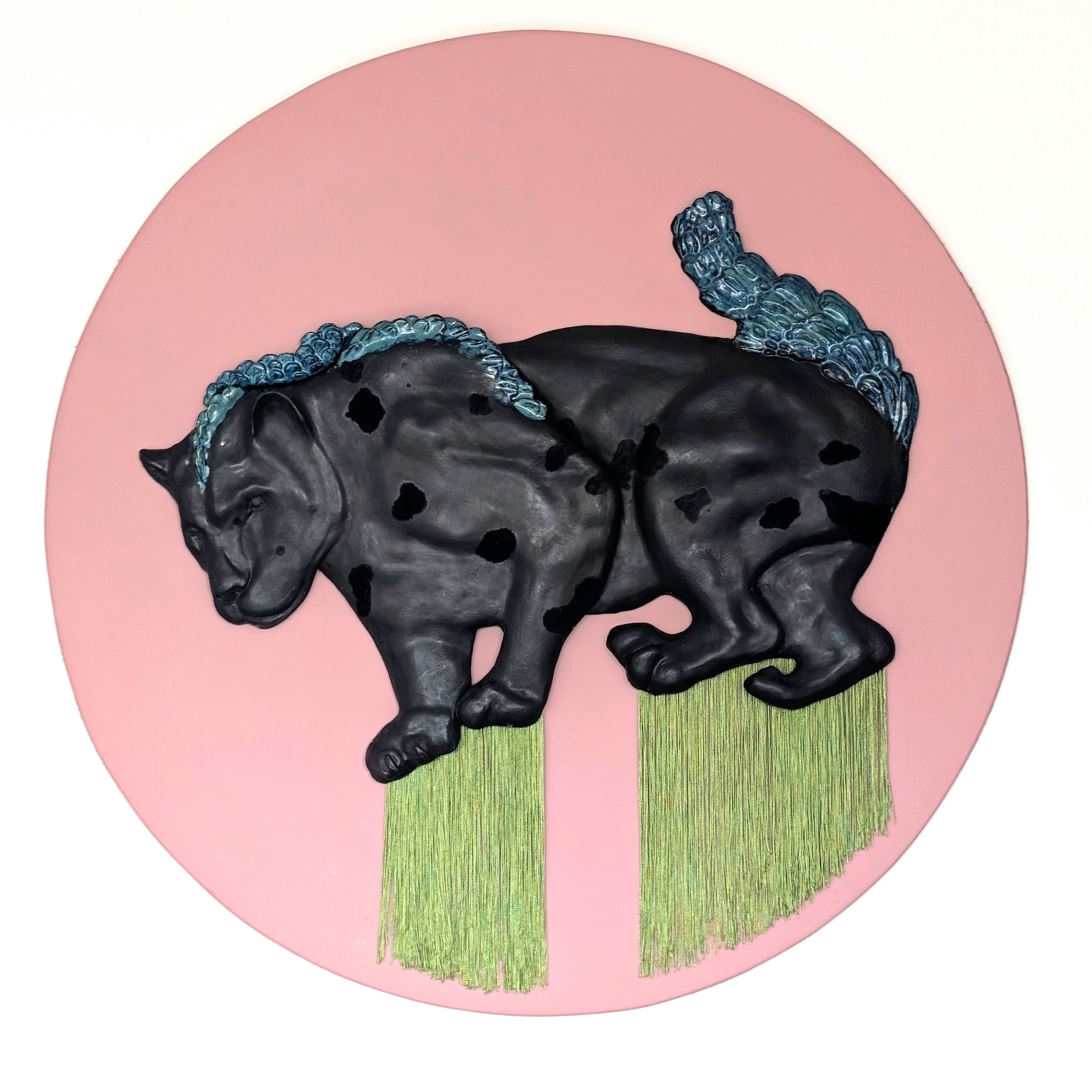 Glazed ceramics, flocking, textiles,  circular panel, mixed media